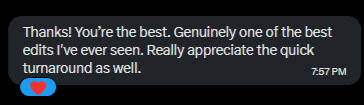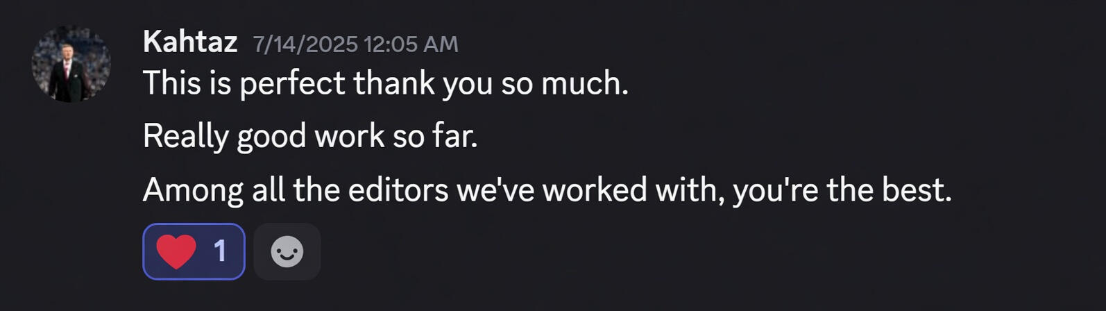 He's a one of a kind editor who doesn't need to be babysat through the editing of the video. Explain what you want to him and he gets it done and if theres any adjustments that need to be made he makes them at a moments notice with no hassle required. He's very timely and is an excellent communicator. Very happy with the work we've done so far, couldn't have asked for better.